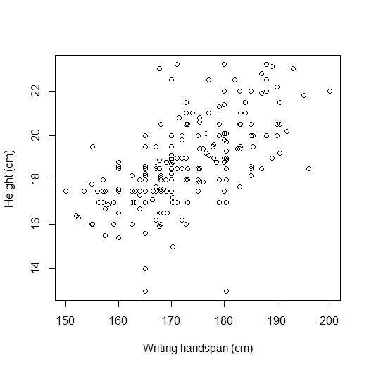 plot(survey$Height, survey$Wr.Hnd, xlab="Writing handspan (cm)", ylab="Height (cm) ")